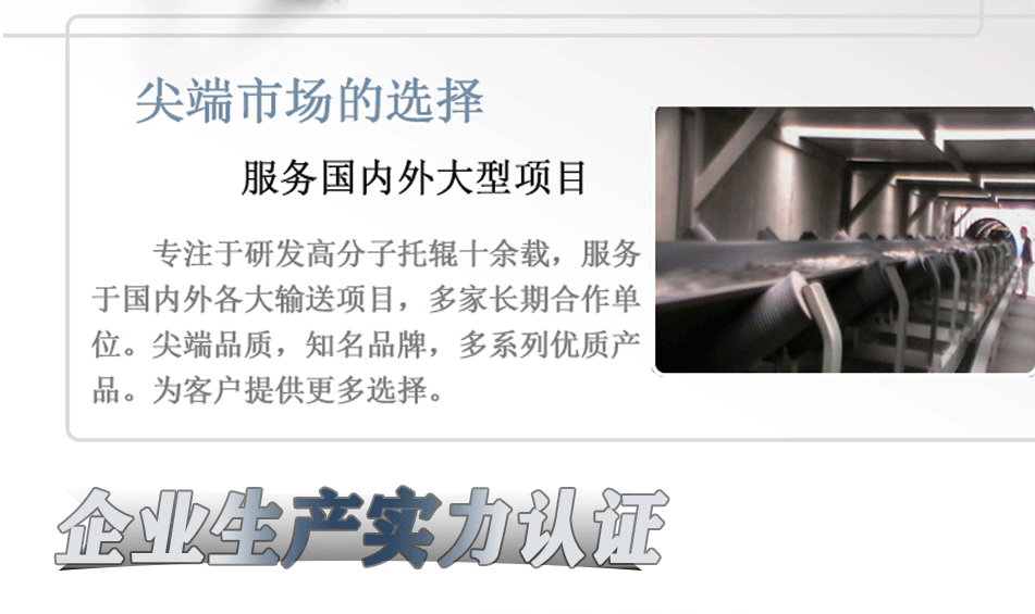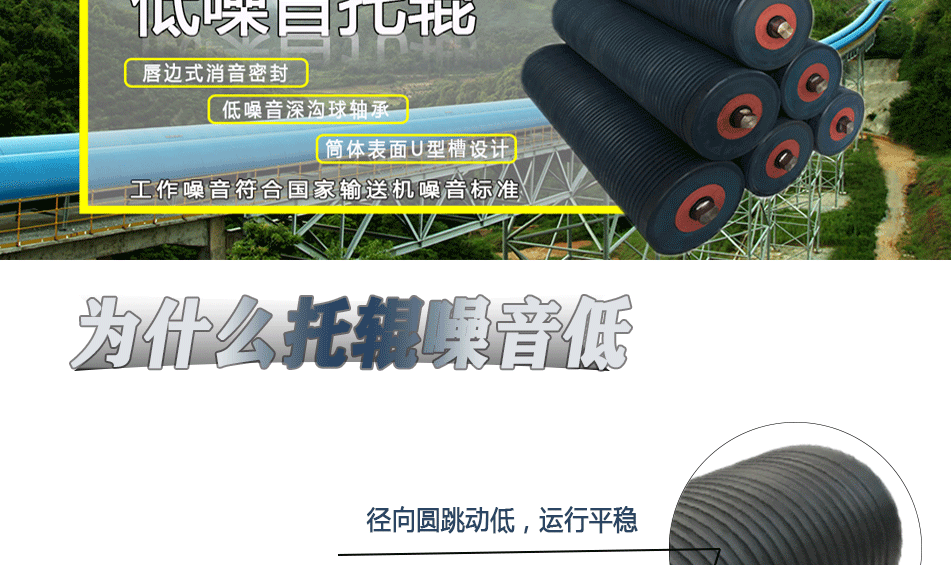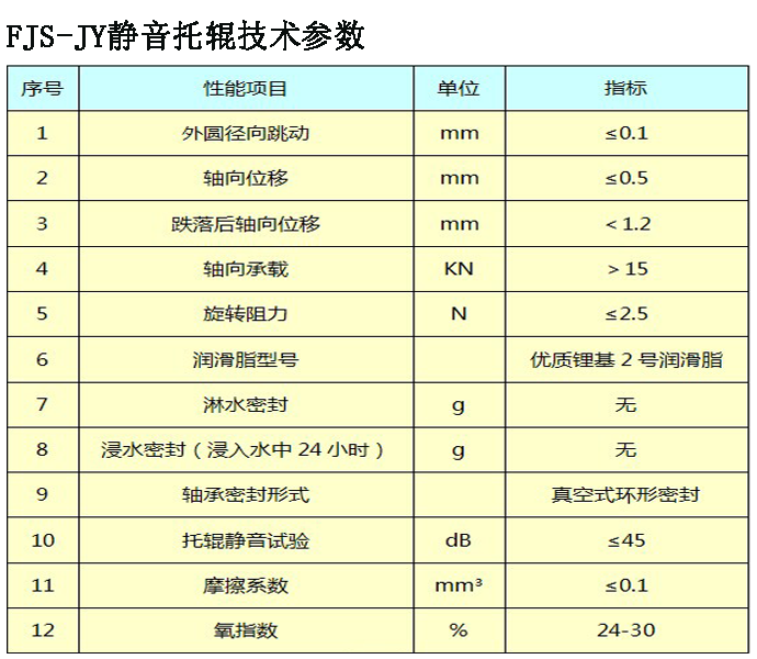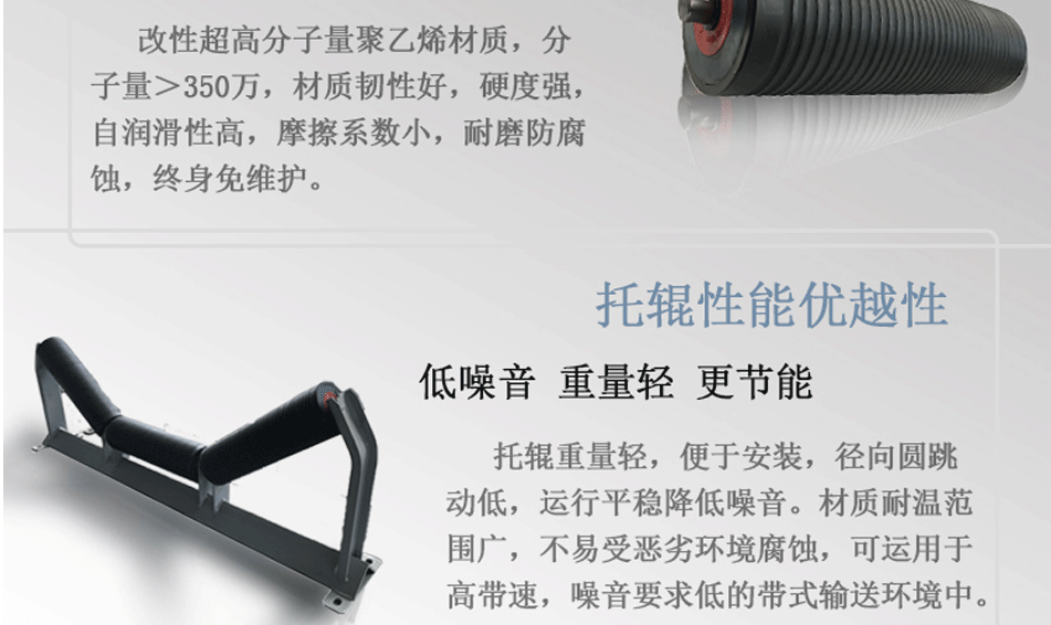 產(chǎn)品簡介    FJS-JY低噪音托輥,其管體選用優(yōu)質(zhì)改性超高分子量聚乙烯UHMW-PE)主材料,通過良好的生產(chǎn)加工工藝,使動(dòng)平衡等級(jí)達(dá)到G16(ISO1940)標(biāo)準(zhǔn),運(yùn)行平穩(wěn),U型通風(fēng)槽精細(xì)加工,減少與皮帶的摩擦。結(jié)合華北塑料公司自主研發(fā)的唇邊式消音密封,使帶式輸送機(jī)的噪音降到(達(dá)到)國家標(biāo)準(zhǔn)GB12348以下。